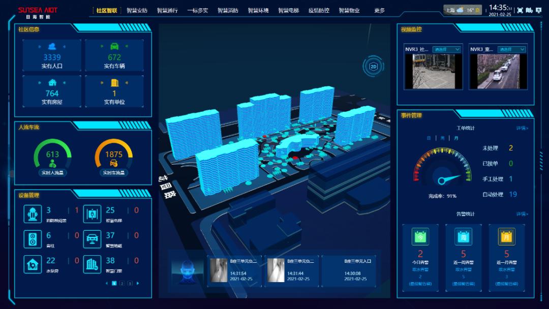 社区应用平台结合底层AIOT的物联能力,将人、车、物的数据进行融合分析应用,实现了人-设备-事件实时感知,动态联动,在该平台上可以全面直观地展示小区人、车、物、房的运行状态,为小区闭环管理、社区综合治理和公安执法监督提供高效、准确、及时的有力支持。比如通过二维/三维地图,可以展示小区楼栋和智能设施的整体分布,以及小区房间和人员构成,方便管理者掌握小区进出人员和车辆,加强社区安全防控。再如打通了门禁、可视对讲、停车、视频监控、电梯、物业管理等多个终端系统,有助管理人员便捷操作,大大节约管理成本。